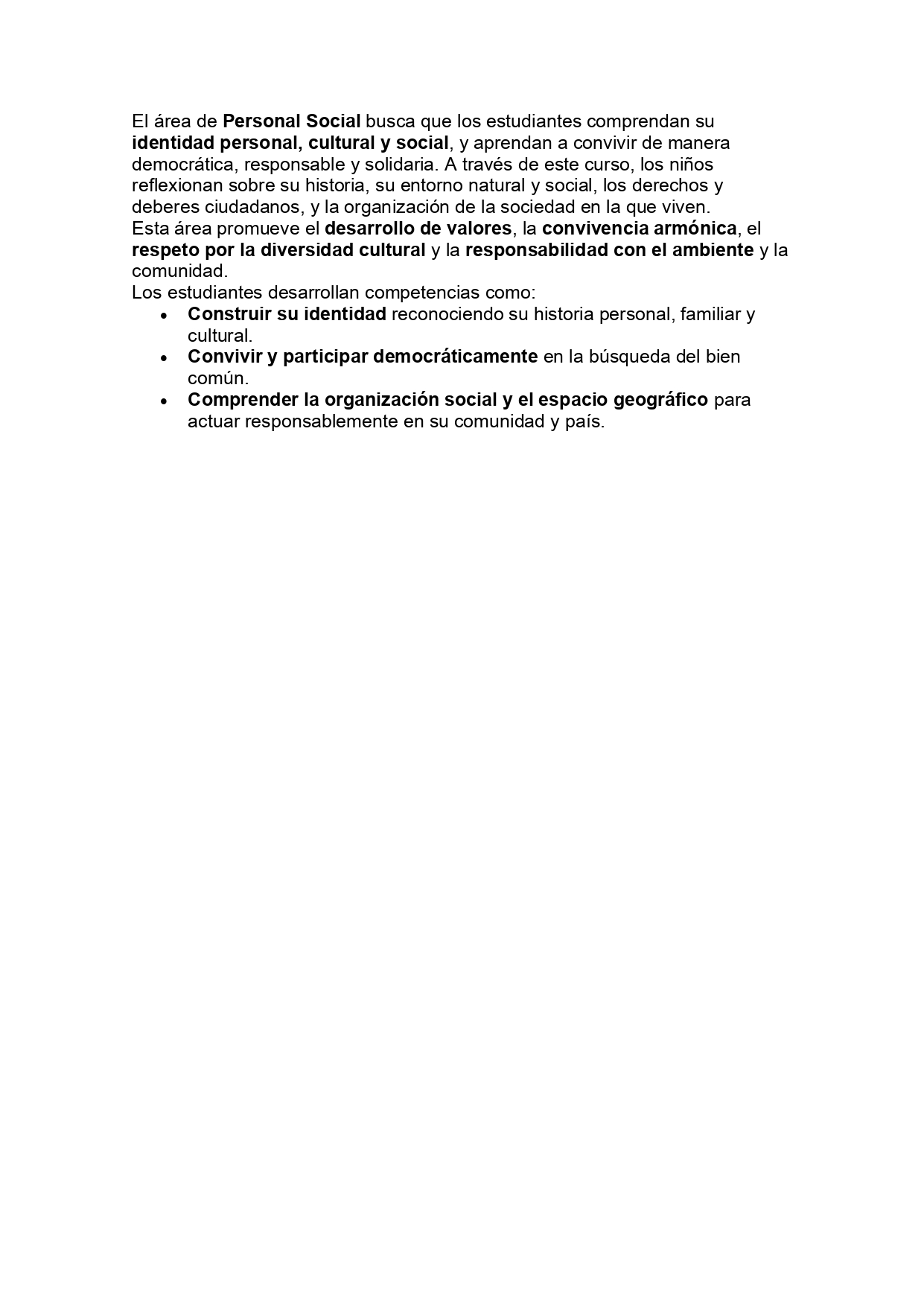 El área de Personal Social busca que los estudiantes comprendan su identidad personal, cultural y social, y aprendan a convivir de manera democrática, responsable y solidaria.